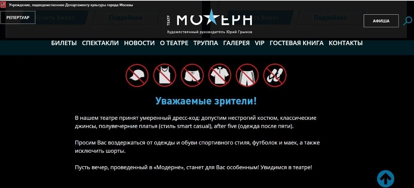 Больше ни в каком другом театре, даже в Большом (!) на главной странице официального сайта вы не увидите правил дресс-кода. Они, вероятно, есть, но не у всех. И чтобы с ними ознакомиться, нужно ещё постараться их найти. А в Модерне — открываете, листаете (афишу с ближайшими датами спектаклей), вам тут же по глазам бьют красные знаки, запрещающие стоянку, парковку шорты и сандалии. Под ними запись о том, что в театре «принят умеренный дресс-код» (чья-то принципиальность всё-таки дала трещину, ещё пару лет назад формулировка была жёстче):