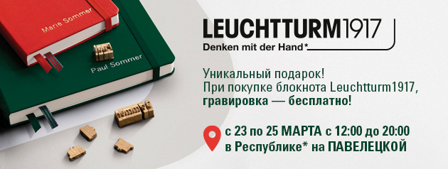 23, 24 и 25 марта в Республике* на Павелецкой (м. Павелецкая, ул. Кожевническая, д.1, стр.1) с 12:00 до 20:00 при покупке любой бумажной продукции от Leuchtturm1917 у вас будет уникальная возможность персонализации: ваше имя или девиз, который сопровождает вас на жизненном пути, никнейм из социальных сетей.