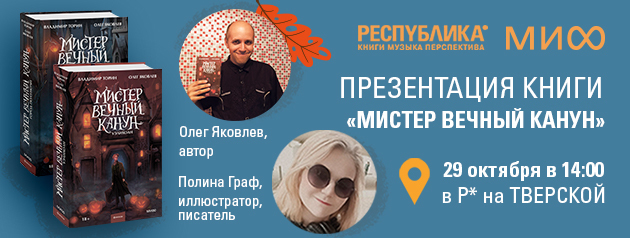 В субботу, 29 октября в 14:00, в РЕСПУБЛИКЕ* на Тверской пройдет встреча с Олегом Яковлевым — писателем, фантастом, соавтором книги «Мистер Вечный Канун», и Полиной Граф — иллюстратором и писателем, создавшей невероятные обложки к обеим частям «Кануна».