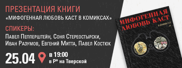 25 апреля в 19.00 в магазине Республика* на Тверской (м. Маяковская, ул. 1-я Тверская-Ямская, 10), пройдёт пройдет презентация книги «Мифогенная любовь каст в комиксах».