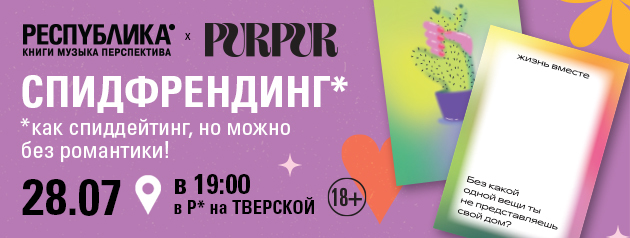 Спидфрендинг Пурпур х Республика* прежде всего — классный опыт знакомств и общения, поэтому иметь романтические планы на этот вечер совсем не обязательно!